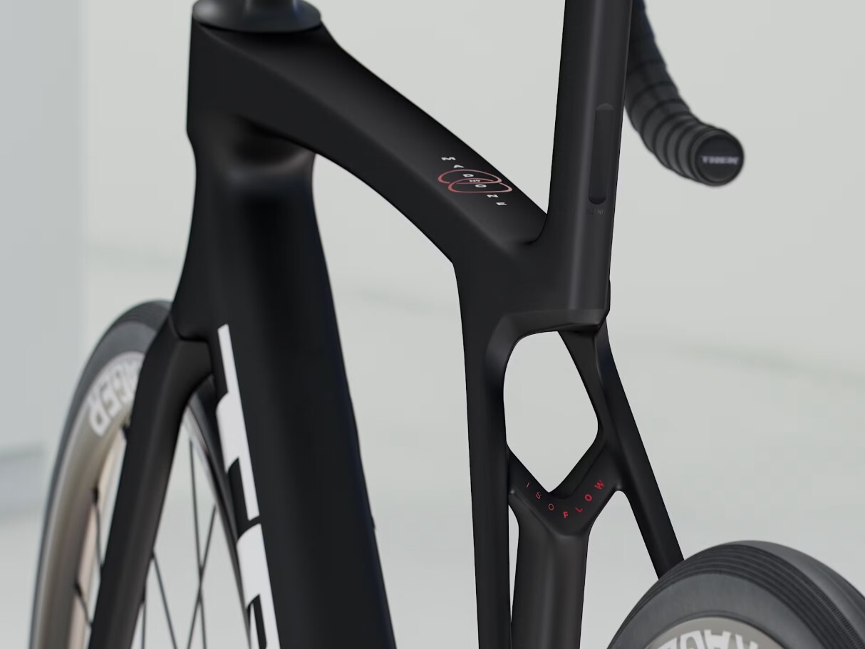 Madone Gen 8 полностью карбоновый, конический карбоновый руль, внутренняя прокладка тормозных тросов, диск с плоским креплением, сквозная ось со скошенными краями 12x100 мм